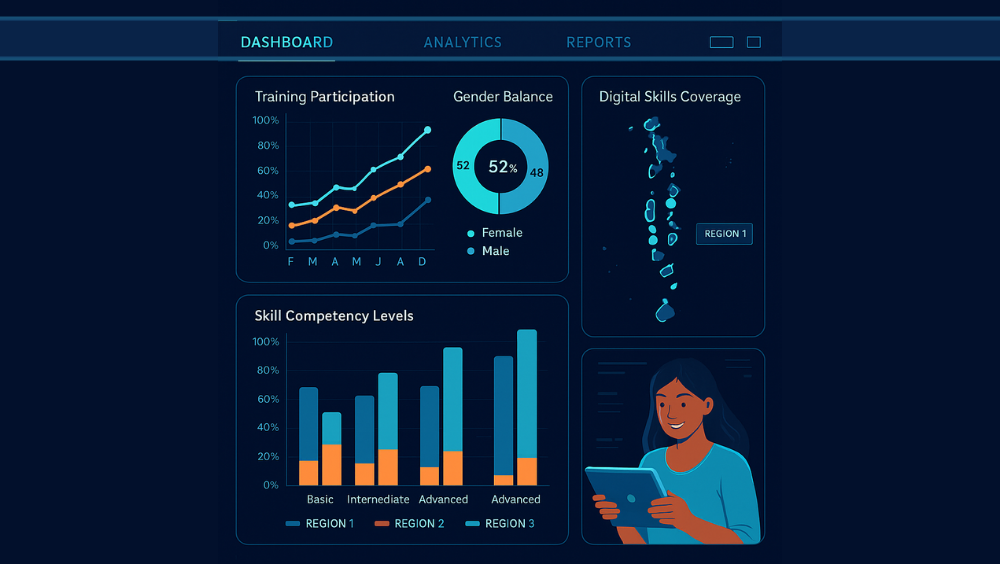 10,000+ people trained over 3 years, active digital service hubs in each atoll, gender-balanced participation, and better policy and donor coordination through shared data insights.